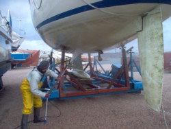 Pesemme veneen pohjan heti noston yhteydessä jolloin saamme kaiken liannäkkejä myöten irti. Pohjan ja kyljet pesemme paineella ja kannen harjalla koska yleensä kansien luukkujen ja ikkunoiden tiivisteet eivät kestä painetta, samoin teak kansien pesu vaatii huolellista käsittelyä oikeilla aineilla.
